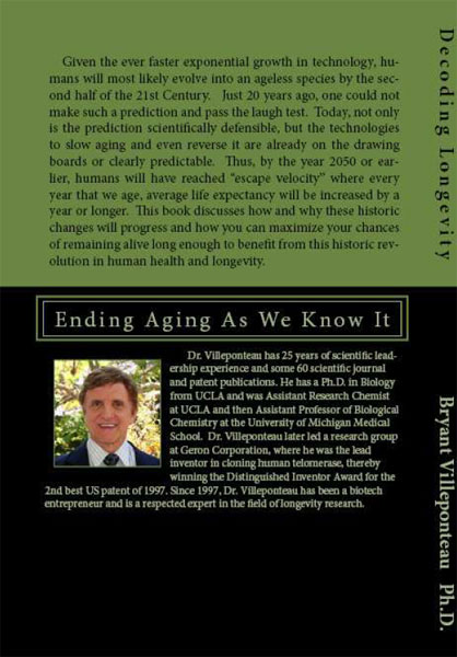 The Author: Dr. Bryant Villeponteau has 25 years of scientific leadership in aging research and some 60 scientific journal and patent publications. He has a Ph.D. in Biology from UCLA and was Assistant Professor of Biological Chemistry at the University of Michigan Medical School in the Institute of Gerontology. Dr. Villeponteau later led the research group at Geron Corporation, where he was the lead inventor in cloning human telomerase, thereby winning the Distinguished Inventor Award for the 2nd best US patent of 1997. Since 2008, Dr. Villeponteau has used genetics and machine learning technologies to develop antiaging supplements and drugs. He also cofounded Centagen, a Colorado biotechnology company.